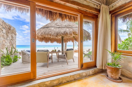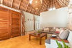 Escápese a una casa privada en la playa del Caribe y alójese en esta palapa de un dormitorio con cama king size, sábanas de alta calidad y dosel con cortinas. Decorada con muebles de madera natural hechos a mano en Tulum, esta casa de playa ofrece una sala de estar con cómodos asientos, perfecta para recibir invitados. Disfrute del amplio espacio exterior con sillas y una hamaca para relajarse con vistas al mar, a solo unos pasos.
